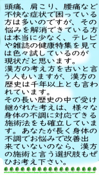 - ですから漢方整体の施術は独特な心地良い刺激を身体に与えて悩みの解消へと向かわせるのです。