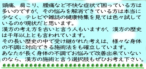 - 漢方整体院のホームページ『整体の森』へお越し頂き、ありがとうございます。